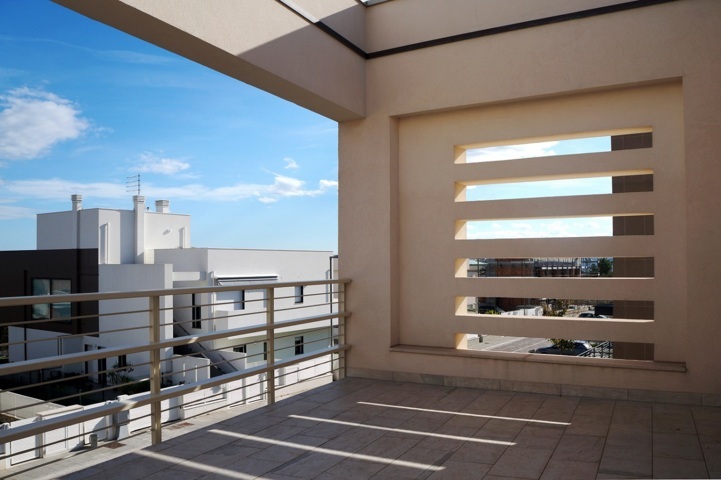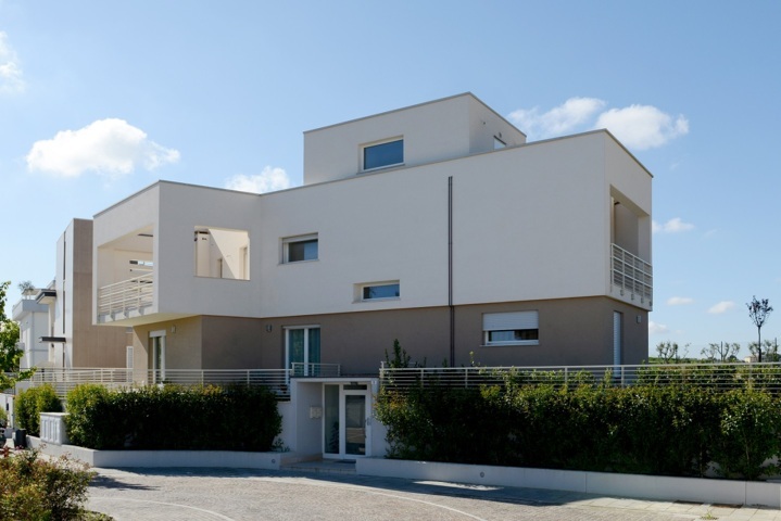 Il contrasto cromatico tra il copro superiore e inferiore conferisce carattere longitudinale all’edificio rendendo i volumi ancora più nitidi.